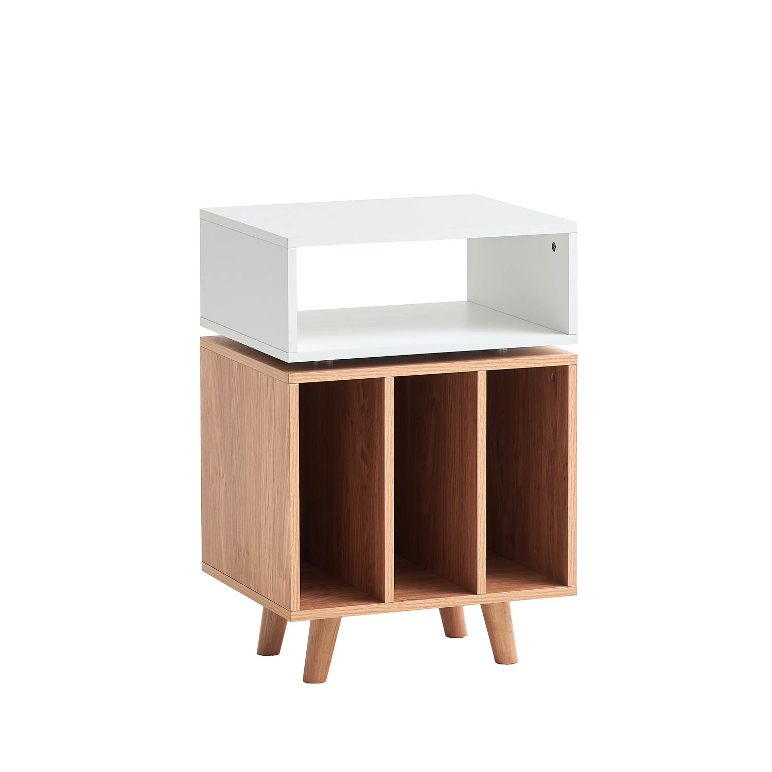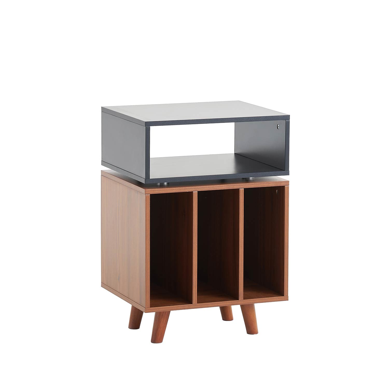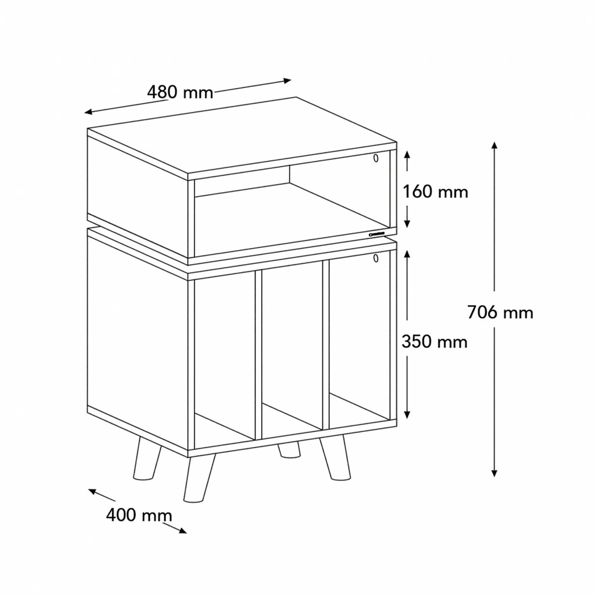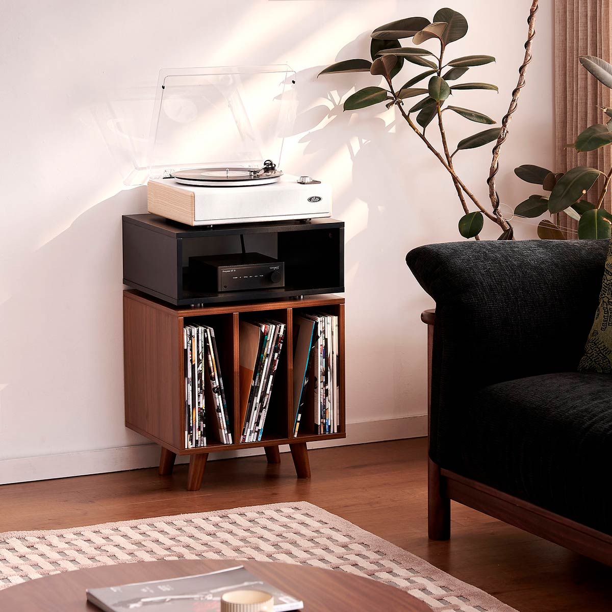På toppen af møblet er der plads til en pladespiller og umiddelbart nedenfor, kan du placere en forstærker, med let adgang til betjening. Den øvre del af møblet er afkoblet med spikes for reduceret overførsel af vibrationer mellem delene. Den nederste del af møblet har plads til vinylplader, ca. 80 styk, med en samlet maksimal vægt på 30 kg. Den øverste del af møblet har en bæreevne på kombineret 20 kg.