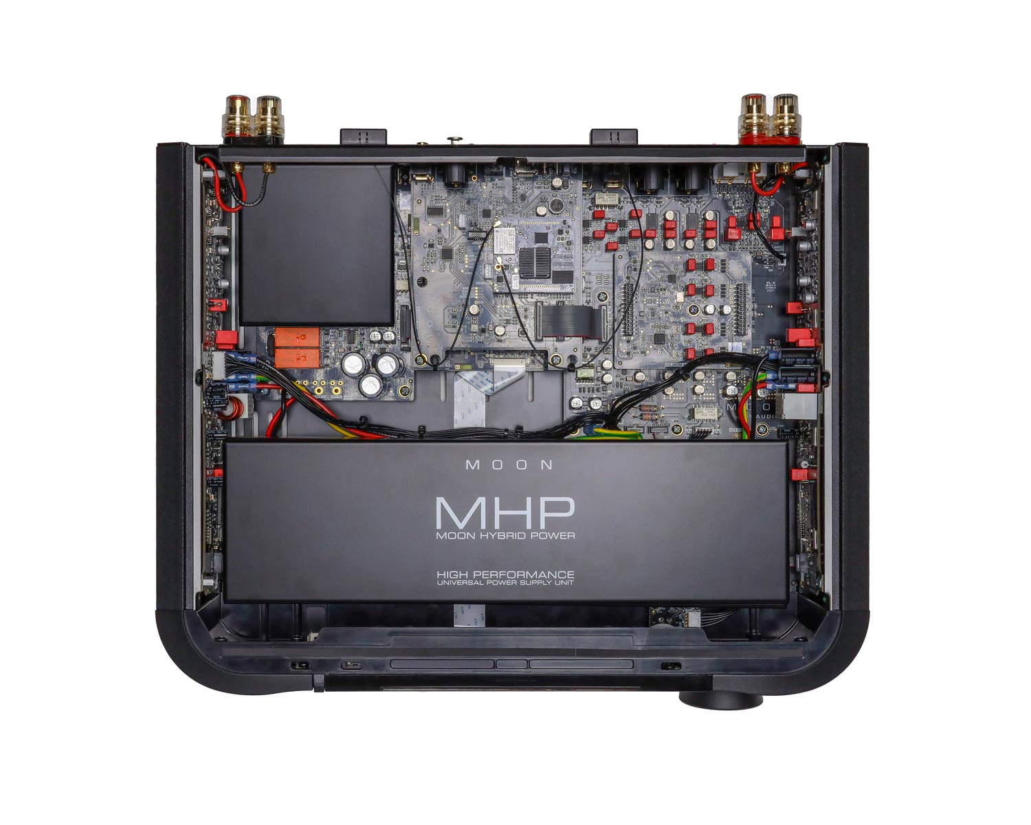 Der er nok ingen grund til at understrege, hvor gennemført et produkt der er tale om her. Canadierne hos Simaudio har gennem flere årtier, været garant for noget af det allerbedste Hi-Fi og High-end vi har set og hørt, og MOON Compass 371 er ingen undtagelse – og sammenlignet med forgængeren ACE, så er 371 forbedret på en lang række punkter. Under hjelmen finder du en kornfodret forstærkerkreds der leverer 2 x 100 watt i udgangseffekt ved 8 Ohm, med dobbelt op til 2 x 200 watt i 4 Ohm. Der således ingen grund til bekymringer om, hvorvidt denne forstærker kan håndtere dine højttalere på optimalt niveau. MOON 371 er den første forstærker fra Simaudio, der er udstyret med MHA (MOON Hybrid Power) strømforsyning. Teknologien benyttes også i Simaudios streamere og DACs, men det hybride design har nu også fundet anvendelse i en forstærker. Herudover benyttes også MDCA (MOON Distortion Cancelling Amplifier), en teknologi som reducerer forvrængning ved ganske enkelt at sammenligne de ind- og udgående signaler, og korrigere for eventuelle afvigelser.