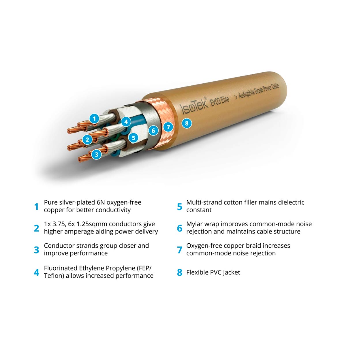 EVO3 Elite er et af de fedeste strømkabler, du kan købe, og det koster slet ikke det, du ville forvente af ydelsen. IsoTek har gennem mange år opbygget sig et velfortjent renomé for en virksomhed, der virkelig ved, hvad de gør på strømsiden, og leverer High-End strømprodukter til særdeles rimelige penge. EVO3 Elite er langt fra et ‘billigt’ strømkabel, men når du hører det, så ved du, hvorfor det er så vigtigt med gode strømkabler. I dette kabel bruger IsoTek nemlig deres unikke 7-kernes teknologi, hvor lederne består af 6 x 1.25 mm2 og 1 x 3.75 mm2 ledere, hvilket ikke bare giver et kæmpe tværsnit, men også nogle helt specifikke fordele. Kablet her nemlig især godt til kilder grundet de mange små ledere - men vi kan garantere for, at det også lyder fabelagtigt på en forstærker.